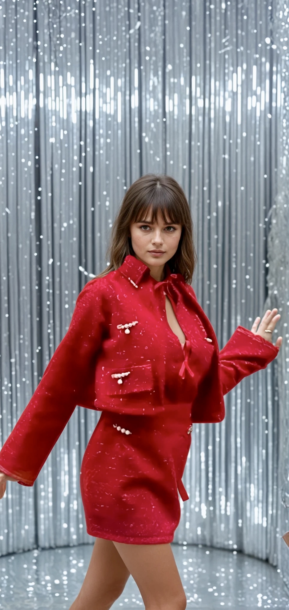 • DĂ©tails coupe trapèze, manches courtes, col rond, poches sur le devant, boutons or.